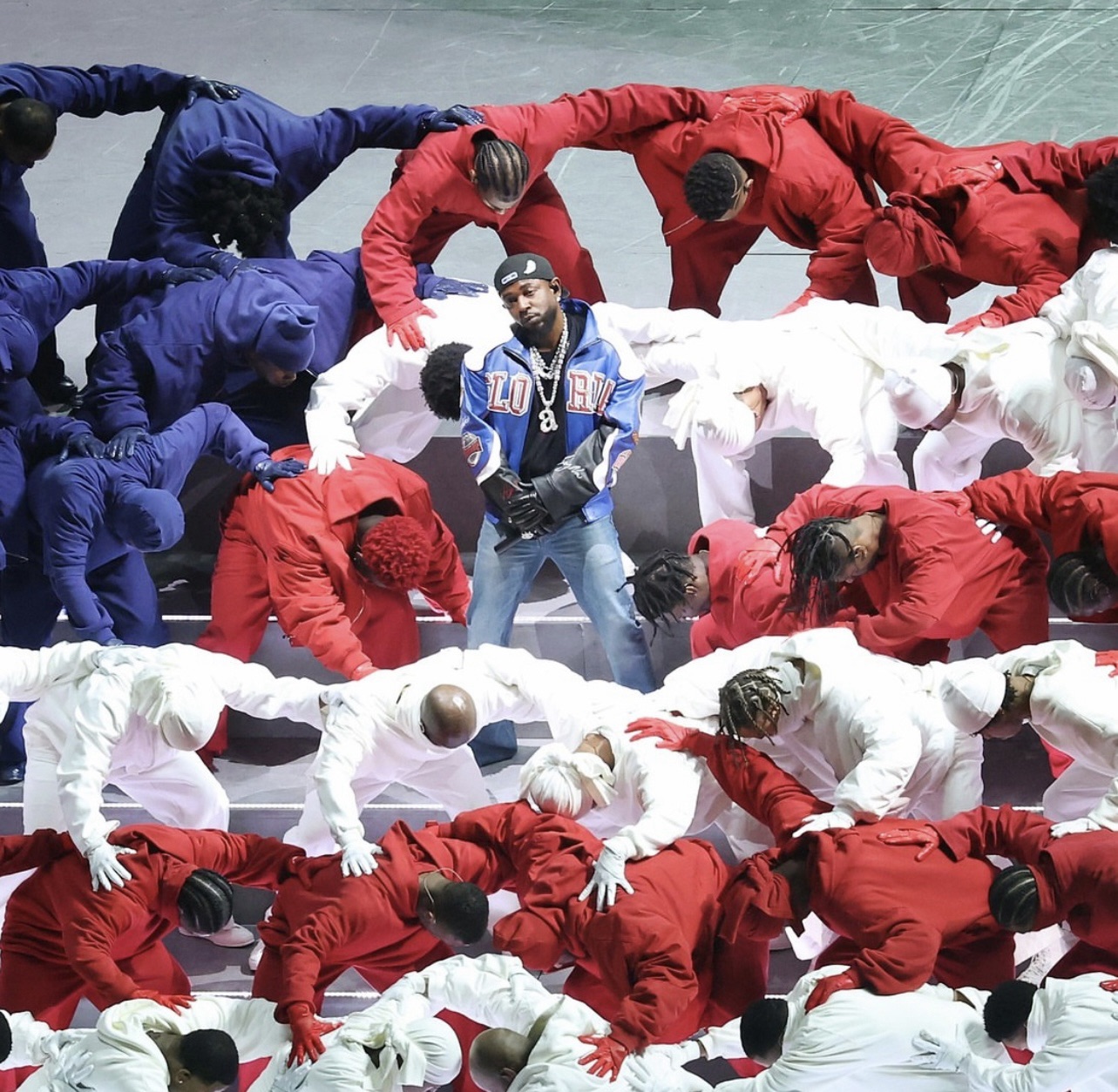 Onyesho lilianza kwa Lamar na Dancers wake kushuka kutoka kwenye gari aina ya Buick Regal ya miaka ya 1980 na kupanda jukwaa lililofanana na kidhibiti cha mchezo wa PlayStation. Samuel L. Jackson alijitokeza kama Uncle Sam, Ndiye Aliyempandisha K-Dot Jukwaani. Mchezaji Wa tenisi Serena Williams alionekana Aki-Vibe wakati wa wimbo “Not Like Us”.