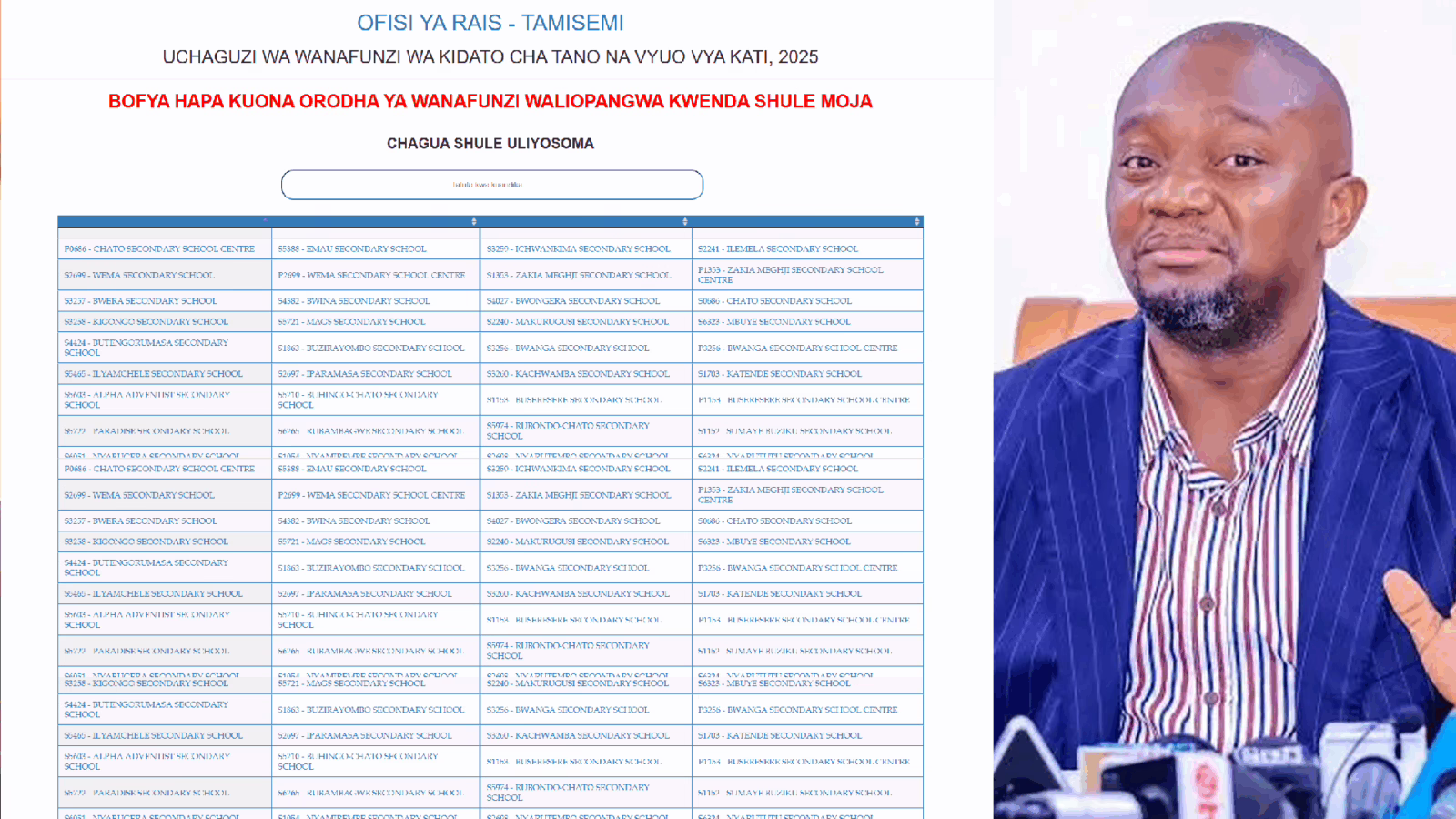 Bofya Hapa Kutazama Orodha kamili ya wanafunzi waliochaguliwa na fomu za kujiunga na kidato cha tano na vyuo vya elimu ya ufundi mwaka 2025. au Tembelea kwenye tovuti za Ofisi ya Rais – Tamisemi (www.tamisemi.go.tz) na Baraza la Taifa la Elimu na Mafunzo ya Ufundi Stadi (www.nactvet.go.tz).