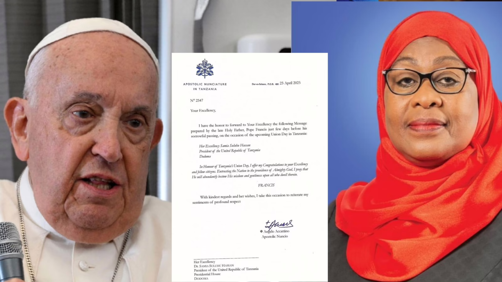 “Kwa unyenyekevu na shukrani, nimepokea ujumbe wa Hayati Papa Francisko kwangu, kwa nchi yetu na kwa Watanzania wote aliouandika siku chache kabla Mwenyezi Mungu hajamwita kwake, na kumkabidhi Balozi wa Vatican hapa nchini, Askofu Mkuu Angelo Accattino.”